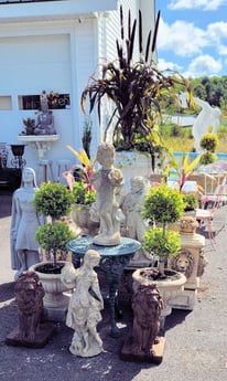 First, you’ll be greeted outside by artfully wrought porch and patio sets, garden urns, pots, statuary, and decorative items.